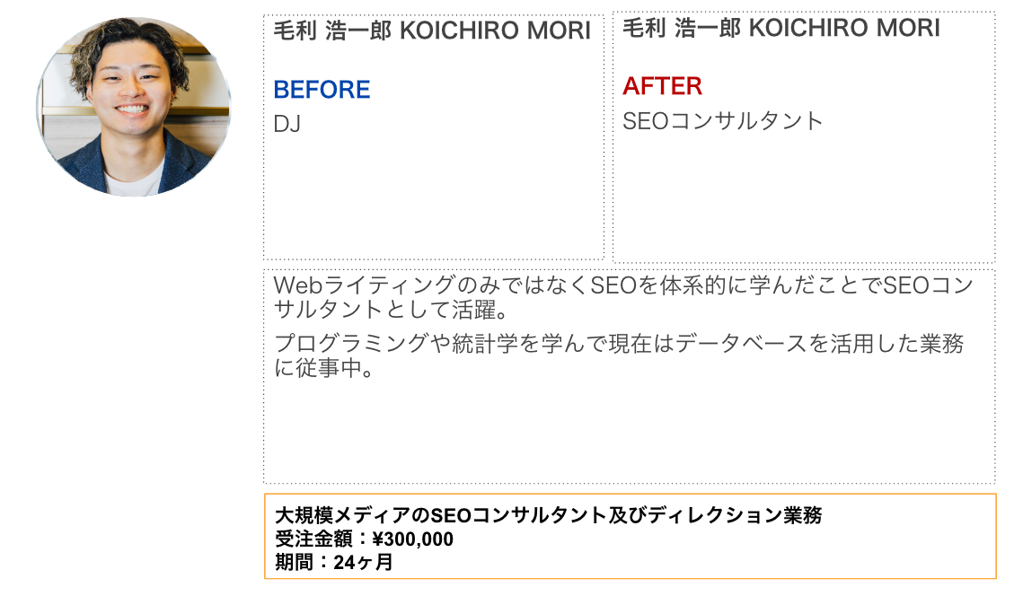 SEO・WEBライターコースを受講したことで、私のライティングスキルは格段に向上し、人生そのものが大きく変わりました。