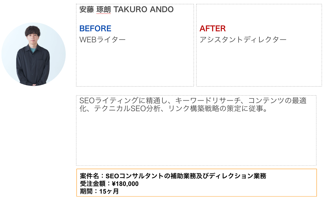 SEOの知識も全くのゼロからのスタートでしたが、コースで基礎から丁寧に教えていただき、検索エンジンの仕組みやキーワード選定、記事構成など、実践的なスキルを身につけることができました。